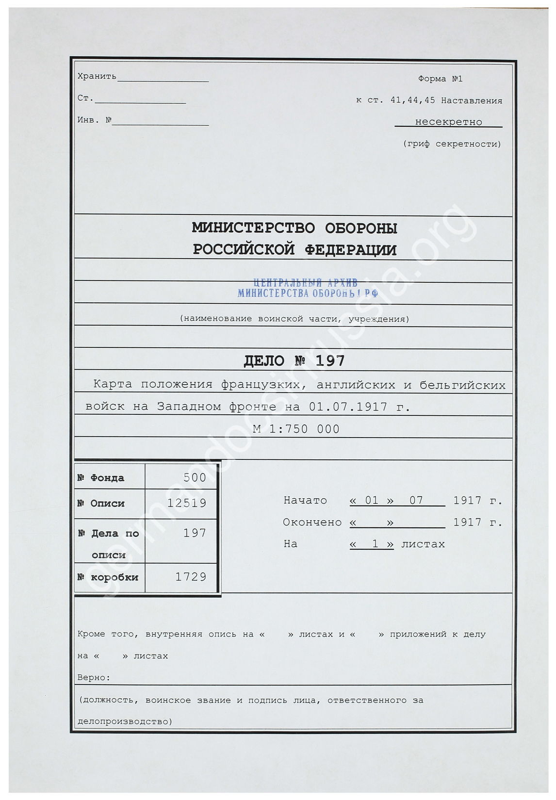 Akte 197. Übersichtskarte des Chefs des Generalstabes des Feldheeres – Abteilung Fremde Heere zur Verteilung der französischen, englischen und belgischen Streitkräfte an der Westfront vom 01.07.1917, M 1:750 000