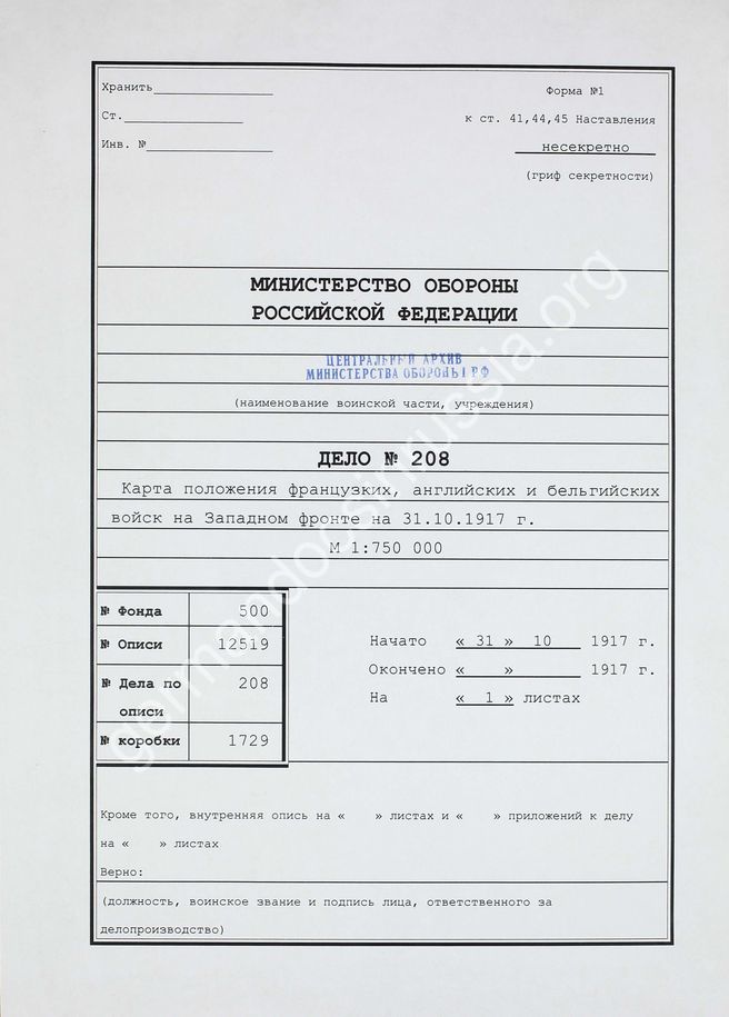 Дело 208. Карта положения французских, английских и бельгийских войск на Западном фронте на 31.10.1917г. М 1:750 000